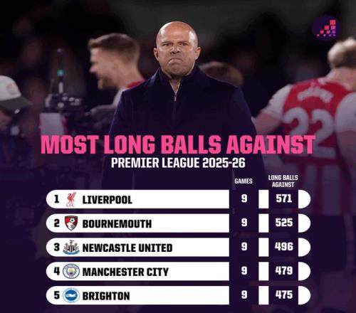 从统计数据可以看到,利物浦新赛季9场英超比赛,被对手用571次长传发起攻击,是所有球队中最多的。 哪怕是第二名的伯恩茅斯,比利物浦少了差不多50次,第4名的曼城比利物浦少了将近100次。